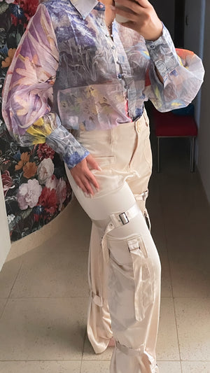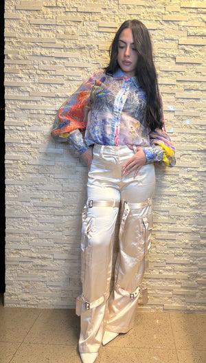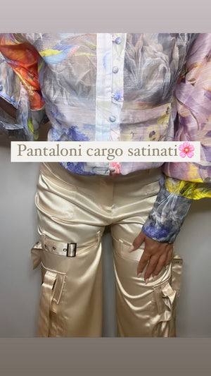 Pantaloni cargo satinati color cipria , tasche sul davanti, lacci regolabili, chiusura frontale con zip e due bottoni , vestibilità regolare Ambra indossa taglia S .