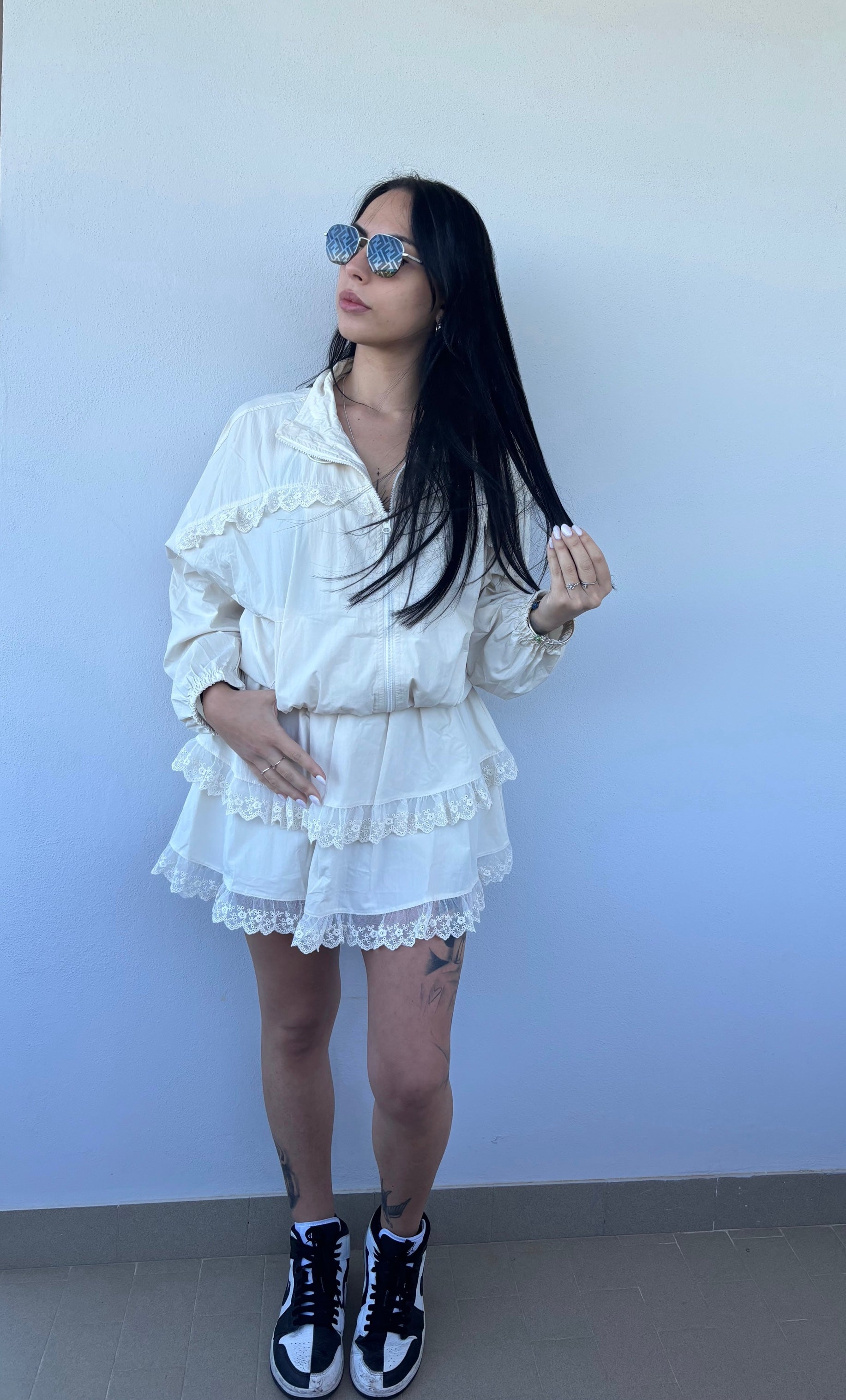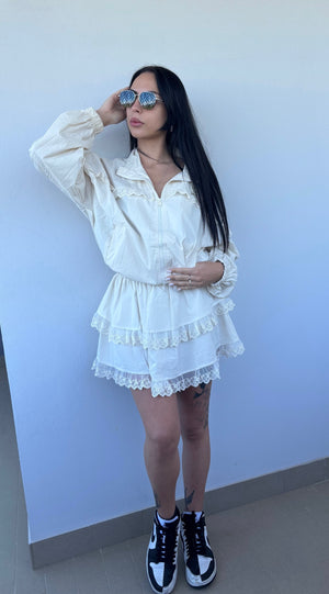 Giacca bianca in tessuto leggero, dal taglio moderno e versatile. La coulisse in vita permette di regolare la vestibilità, sottolineando la silhouette o lasciando un fit più morbido, a seconda delle preferenze. Pantaloncino a gonna dallo stile fresco e femminile, pensato per unire comfort e praticità senza rinunciare all’eleganza. Realizzato in un tessuto morbido e leggero, presenta una fascia elasticizzata in vita che garantisce una vestibilità comoda e aderente, adattandosi con naturalezza alle forme del corpo. Il design effetto gonna sul davanti dona movimento e un tocco sofisticato, mentre lo strato sottostante assicura libertà di movimento e discrezione.