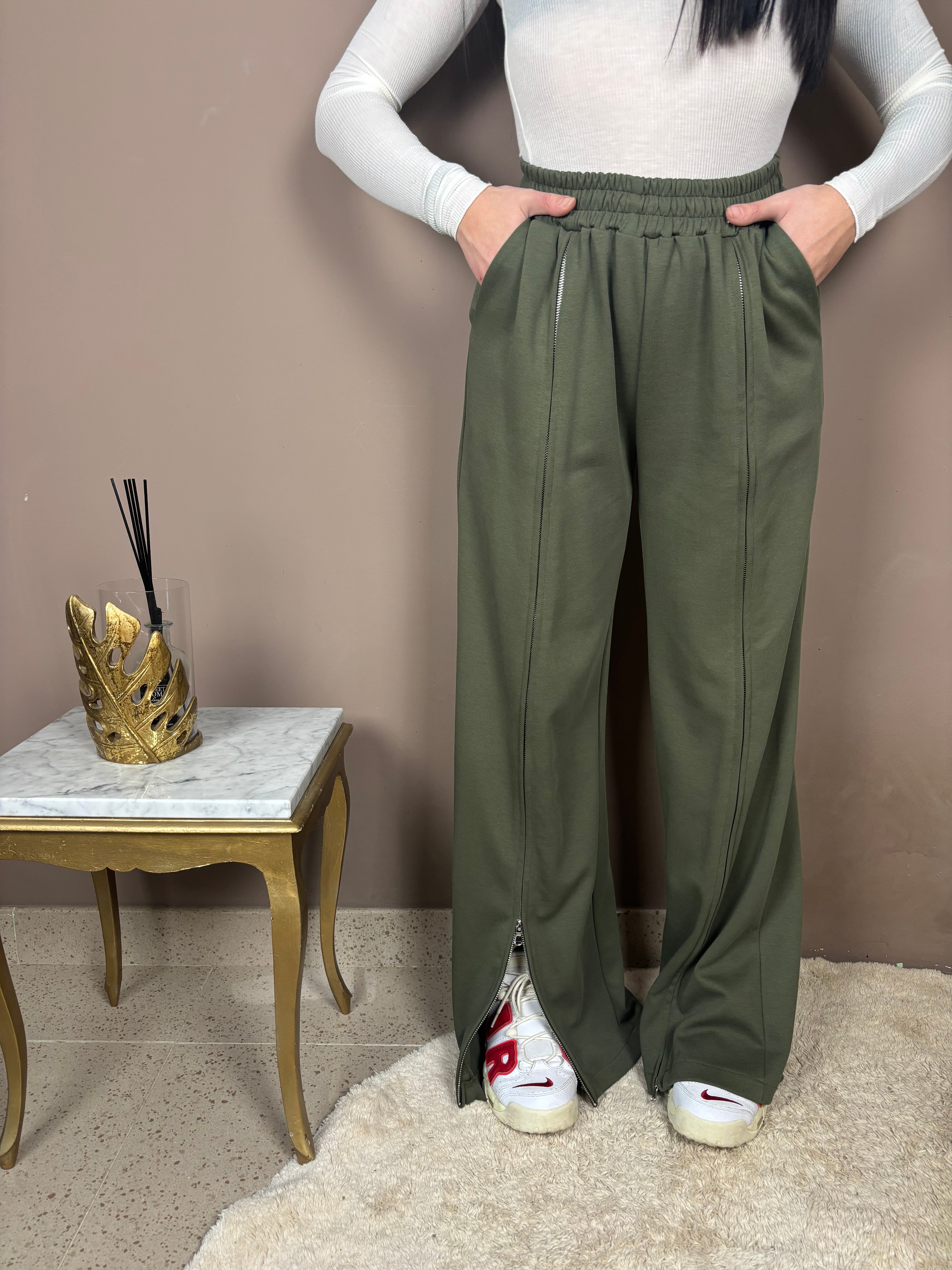 Super comodi super morbidi,Pantaloni tuta con cerniera sul davanti , ma non la classica tutta. Comfy e nello stesso momento glamour ,elastico in vita , vestibilità regolare, Ambra indossa tg.S.