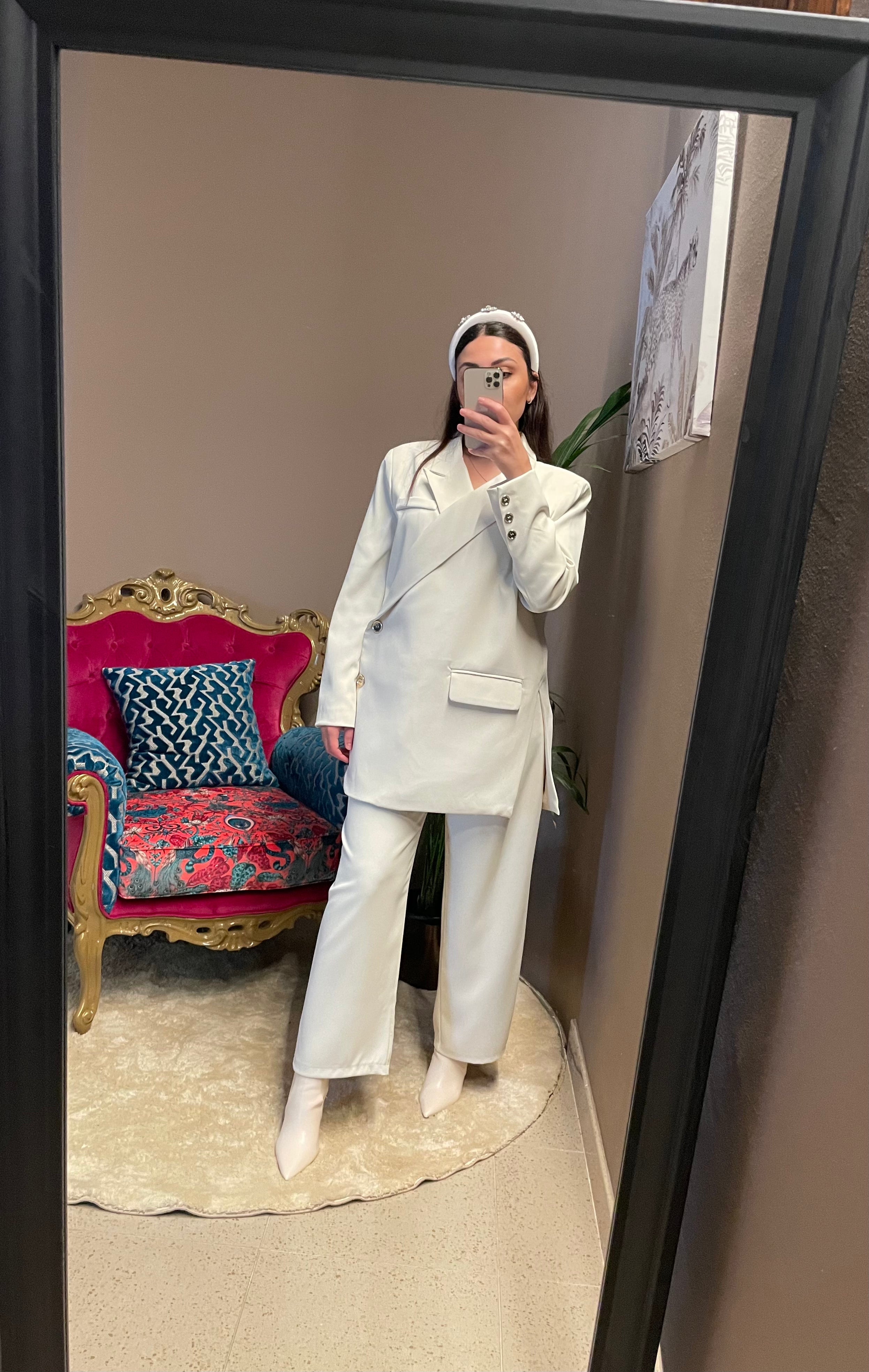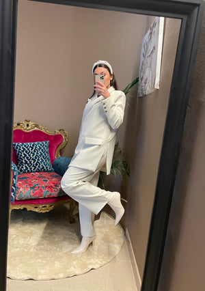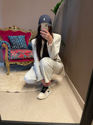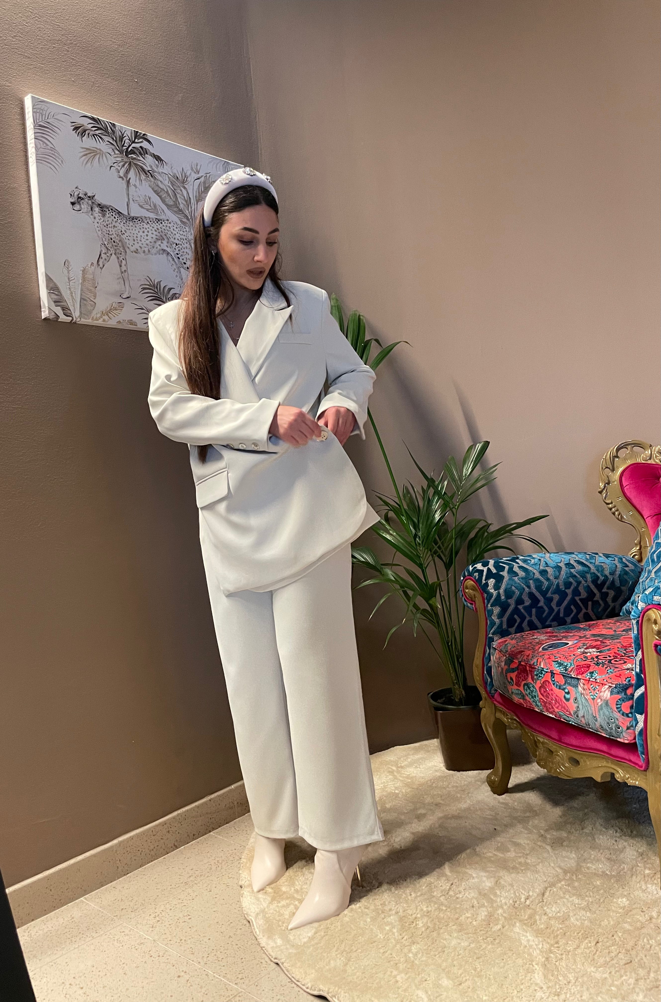 Completo “Maria Vittoria” composto da blazer che si chiude si lato con bottoni leggermente over e pantaloni a gamba dritta, Roberta indossa la S