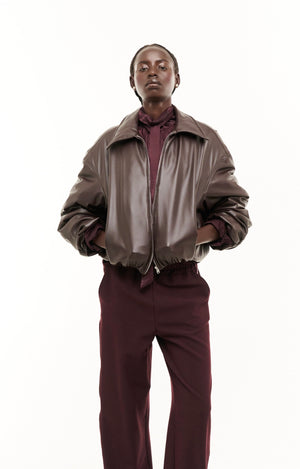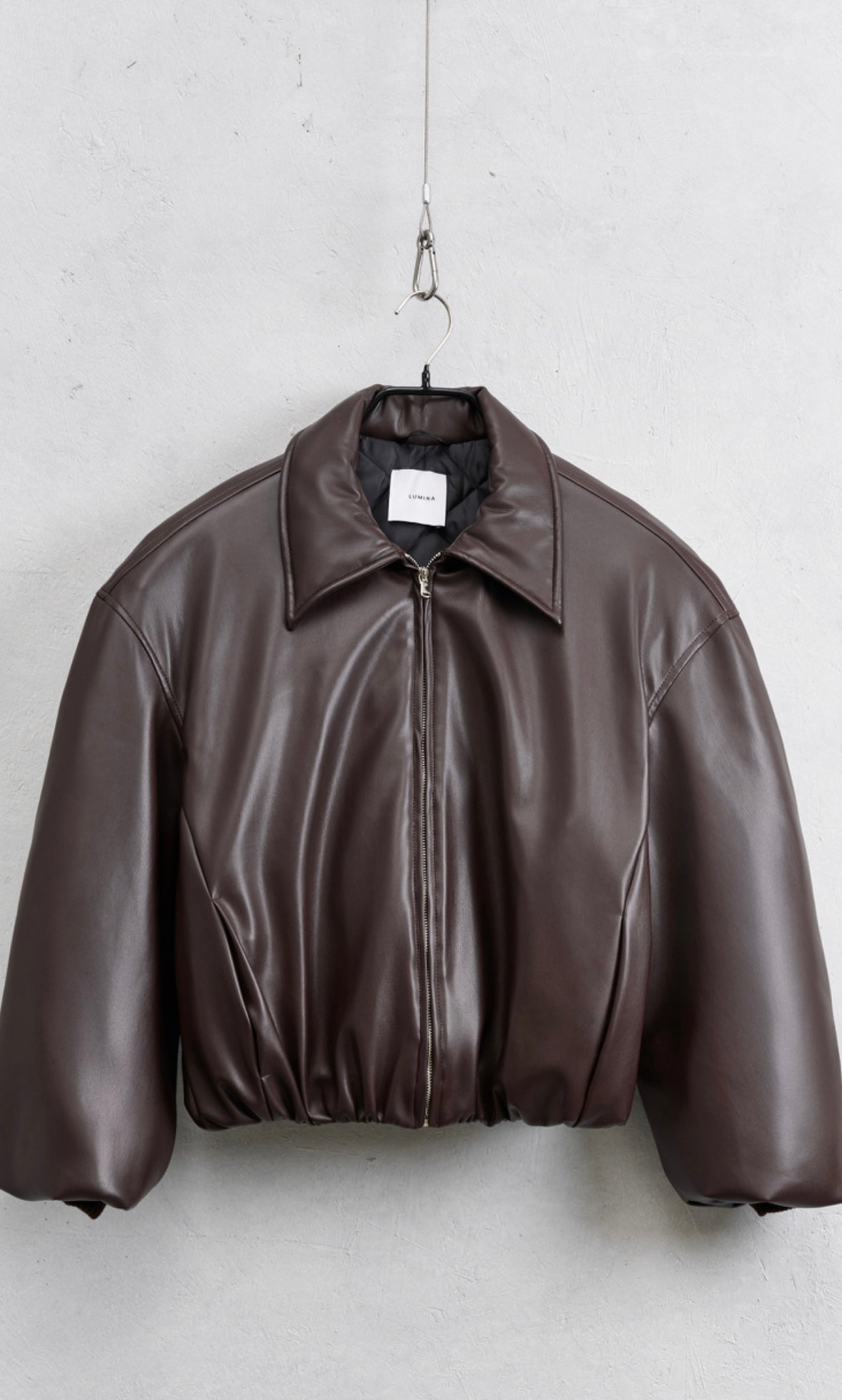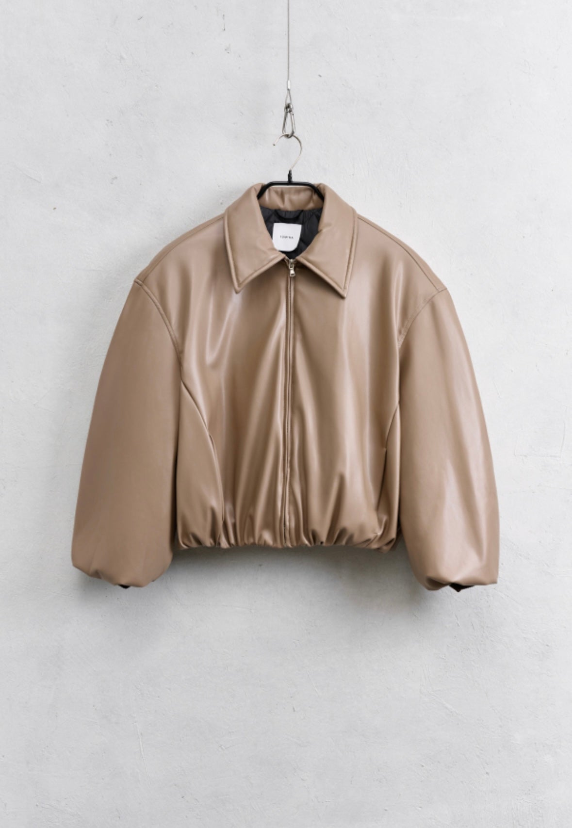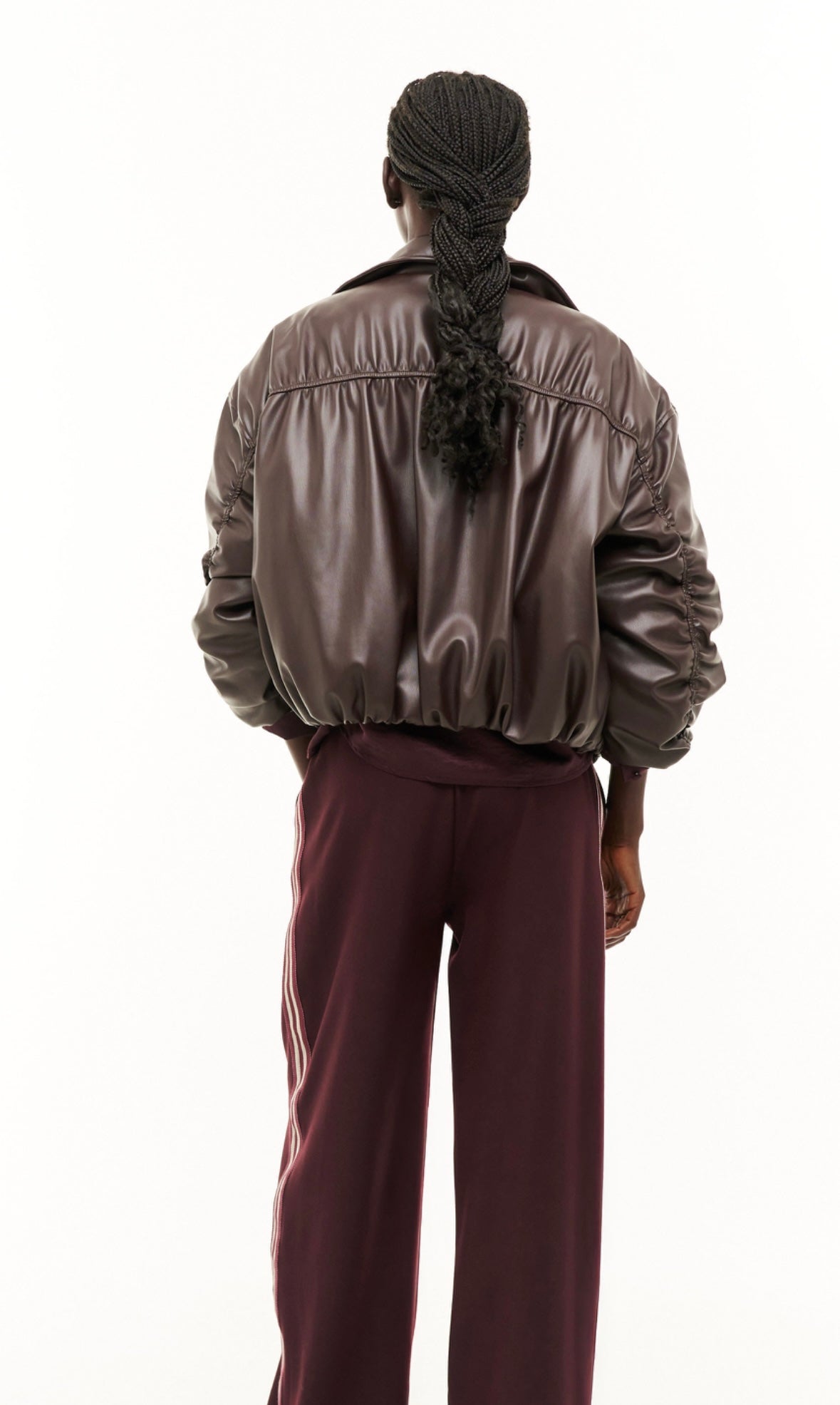 Bomber in eco-pelle.Colletto a revers.Chiusura frontale con cerniera.Pinces anteriori.Elastico sull'orlo.Fit regolare,