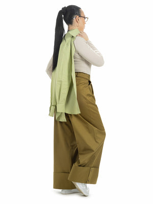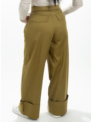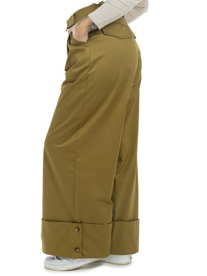 Pantalone verde oliva, dettaglio risvolto in vita , chiusura frontale con zip, gamba larga. Fit regolare Ambra indossa tg.S
