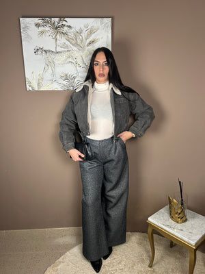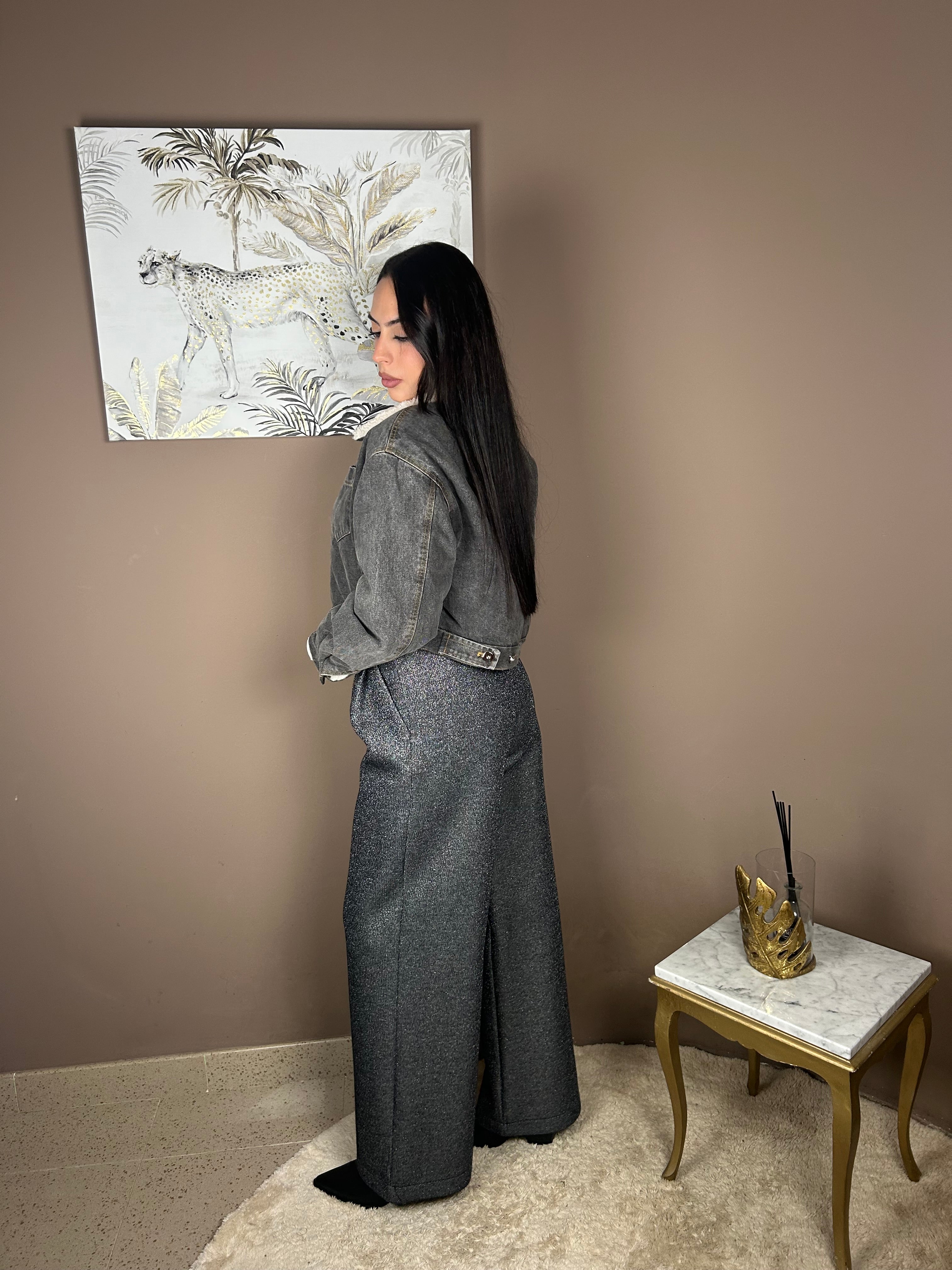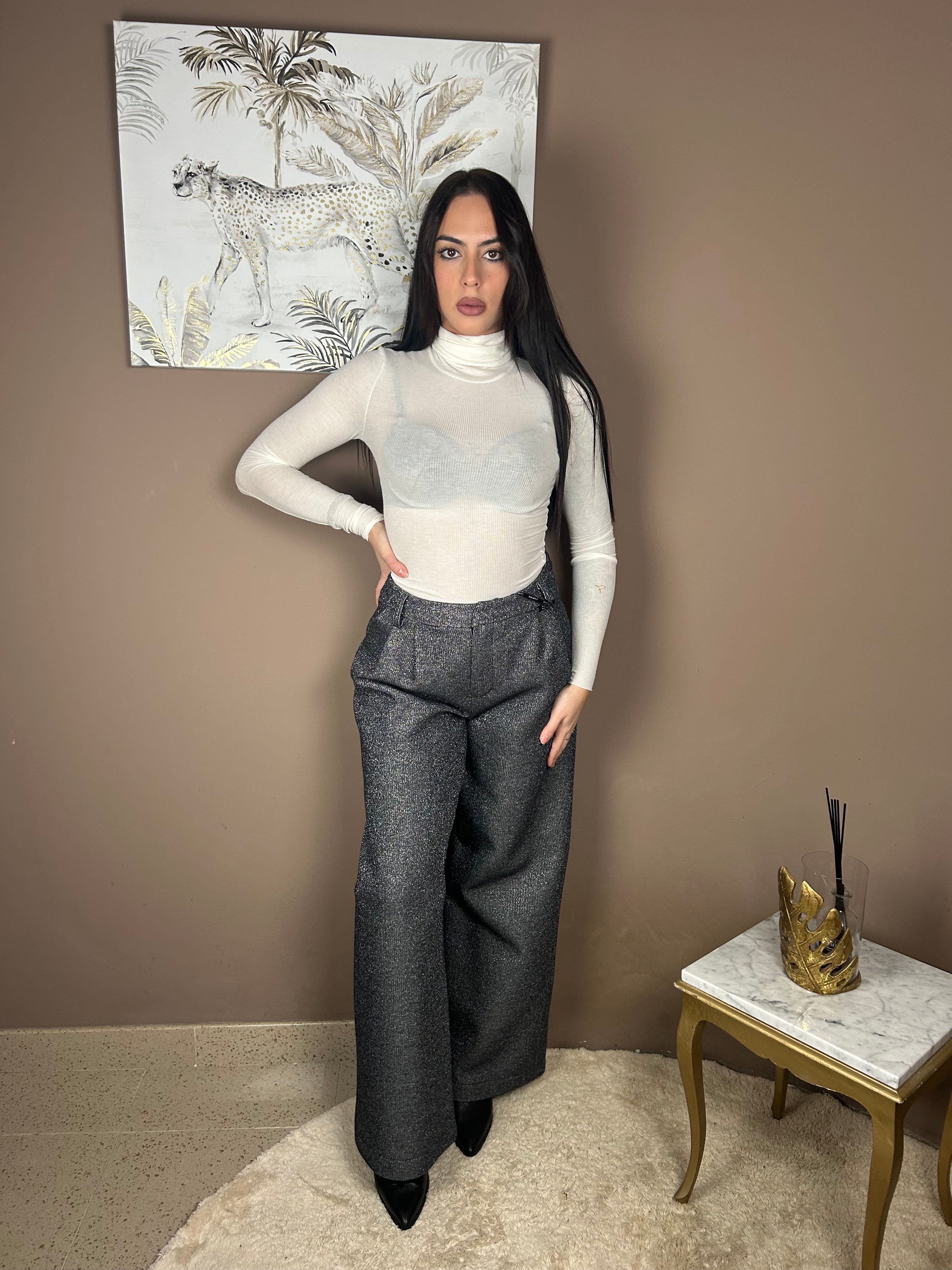 Pantalone palazzo glitter , grigio scuro , presenti tasche anteriori e passanti in vita . Fit regolare . Ambra indossa tg. M