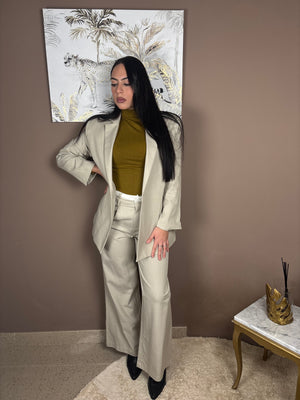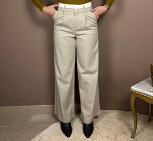 Pantaloni a palazzo , dettaglio fascia in vita a contrasto , presenti tasche anteriori e passanti cintura, tasche a filetto sulla parte posteriore, Fit regolare, Ambra indossa tg. S